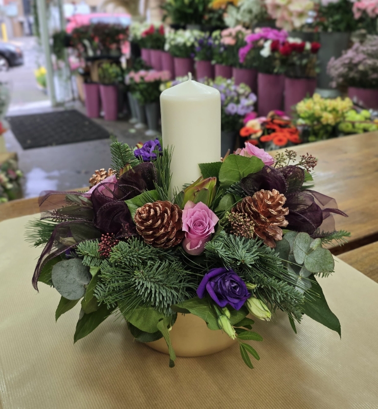 A beautiful festive table arrangement in purples, pinks and golds, finished off with a candle in the centre, the perfect addition to any table.