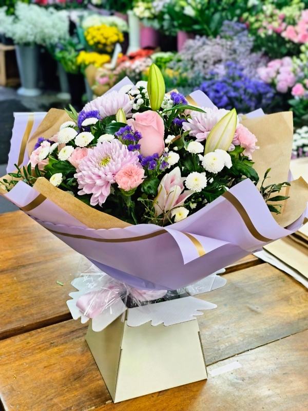 A beautiful handtied bouquet in subtle pinks, whites and lilacs beautifully wrapped and delivered. Perfect for any occasions.